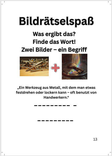 Tipp: Sprich die beiden Bilder laut zusammen, dann entsteht das Lösungswort. 🔄 Manchmal hilft es, die Reihenfolge zu ändern – so findest du die Lösung schneller.